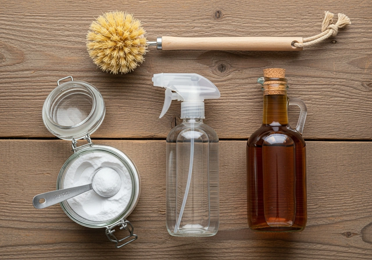 A flat lay image showing vinegar, baking soda, a spray bottle, and a brush on a wooden surface, representing DIY cleaning supplies