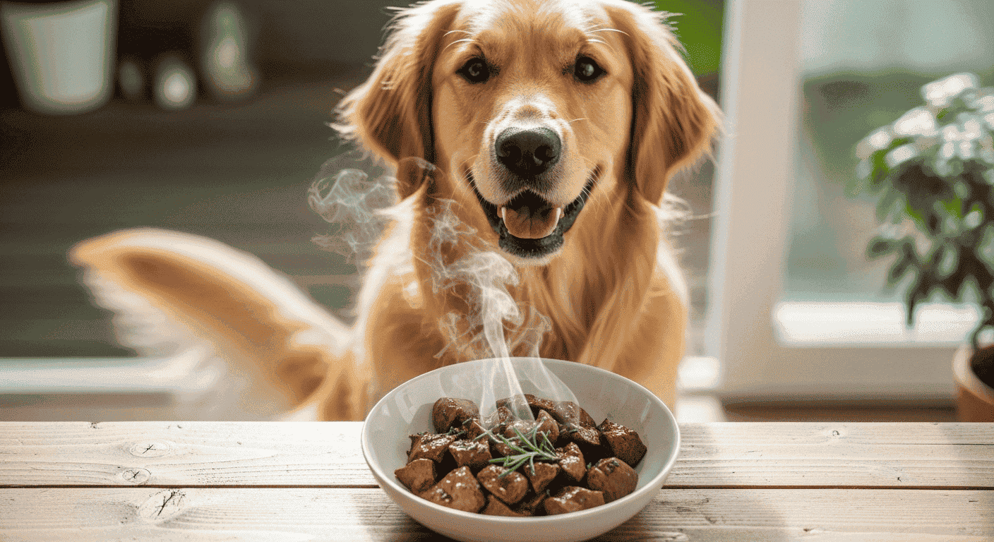 Dog enjoying cooked beef liver, a healthy, nutrient-packed treat when fed in moderation.